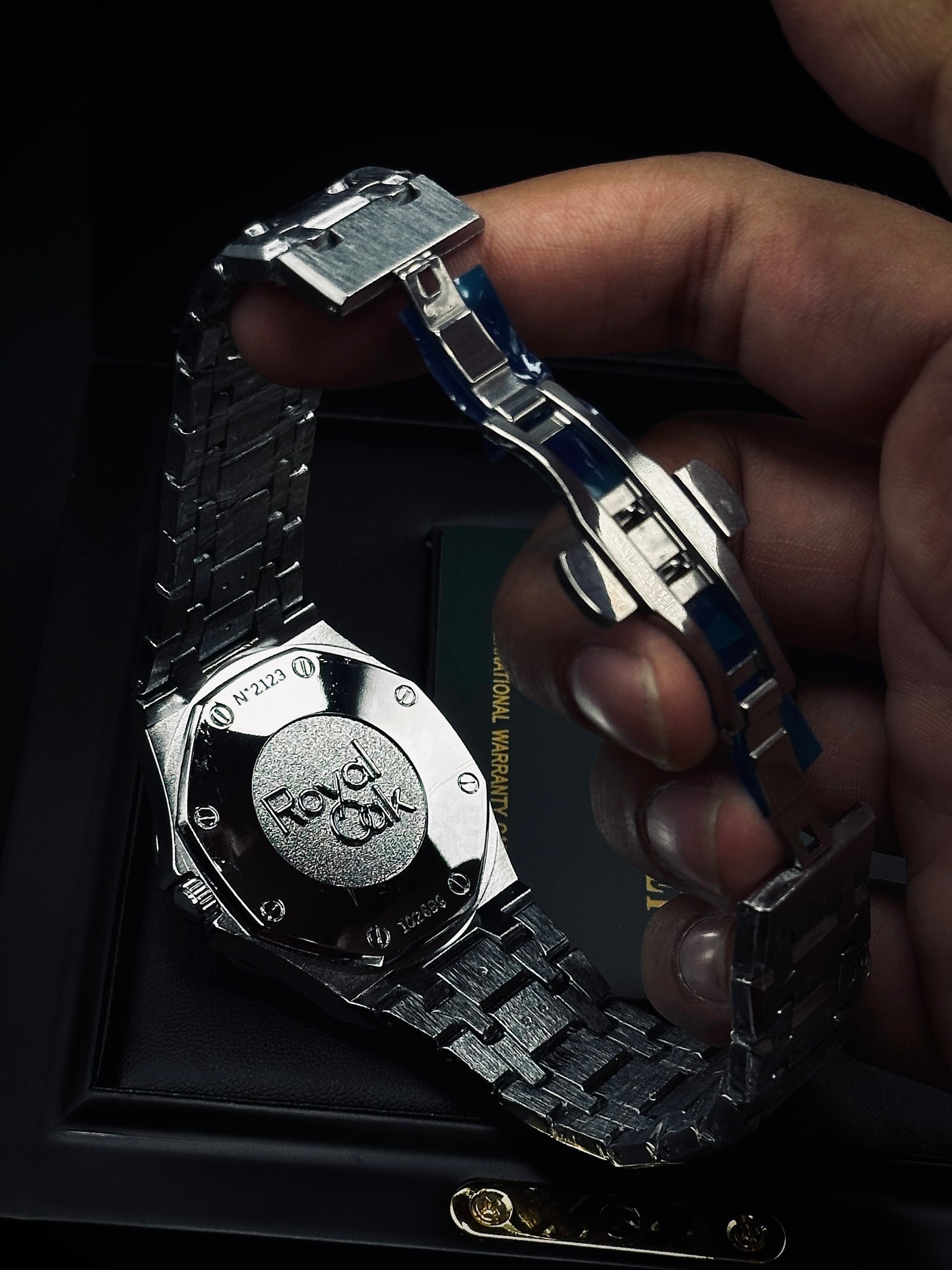 Introducing the Audemars Piguet Royal Oak Copy, a stunning replica with impeccable attention to detail. This watch features a substantial weight and a high-quality chain strap, delivering a luxurious feel on the wrist. It includes a functional date display, adding to its practicality. For packaging options, you can choose a premium large box for an additional charge, or opt for the complimentary DN store packing. This original like copy offers the look and feel of true luxury at an accessible price.