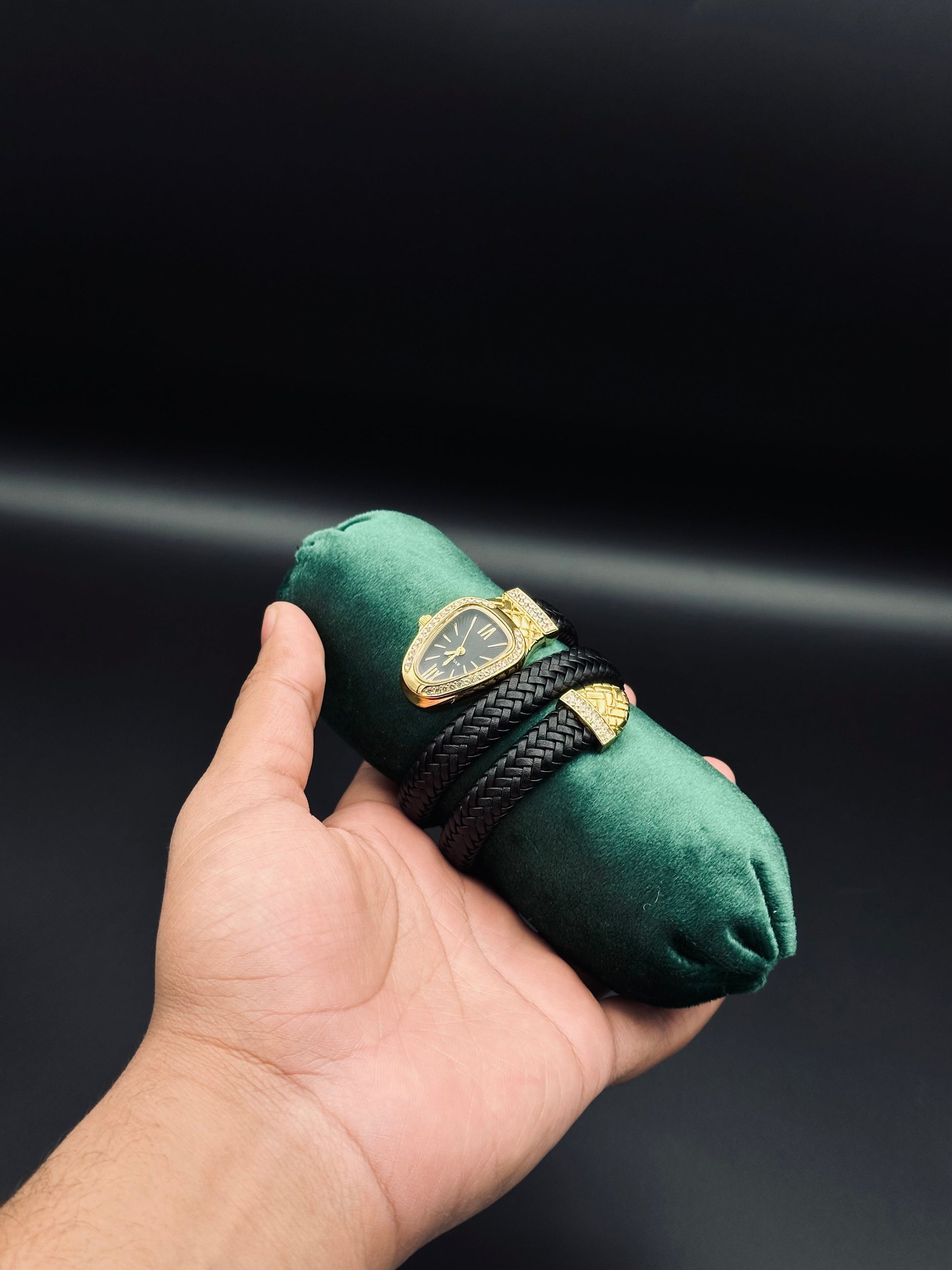 Unleash your bold elegance with this stunning snake-design watch, crafted for women who appreciate luxury with an edge. Featuring a sleek leather strap that wraps gracefully around your wrist, this timepiece is both sophisticated and daring. The snake-inspired design symbolizes power and allure, making it a perfect statement accessory for any occasion. Designed with high-quality craftsmanship, this watch ensures durability while exuding a timeless charm. Whether paired with casual wear or evening attire, its unique aesthetic will elevate your style effortlessly.